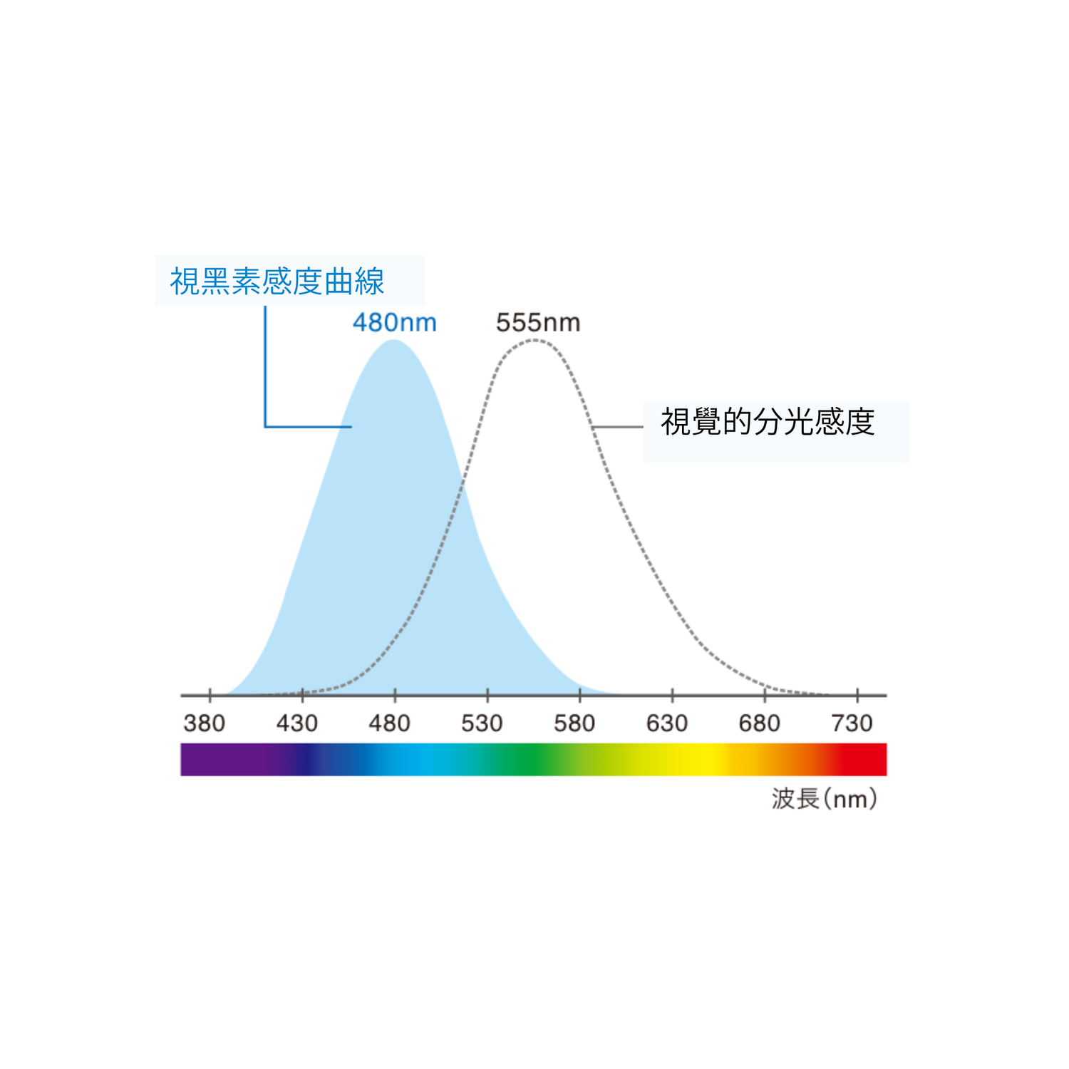 在人眼中存在能感知影響生理節律的光線感測器,如右圖所示,其分光感度(藍光感度曲線)在短波長處具有峰值。因此,如同藍天般的短波長光,會對生理節律產生顯著影響。