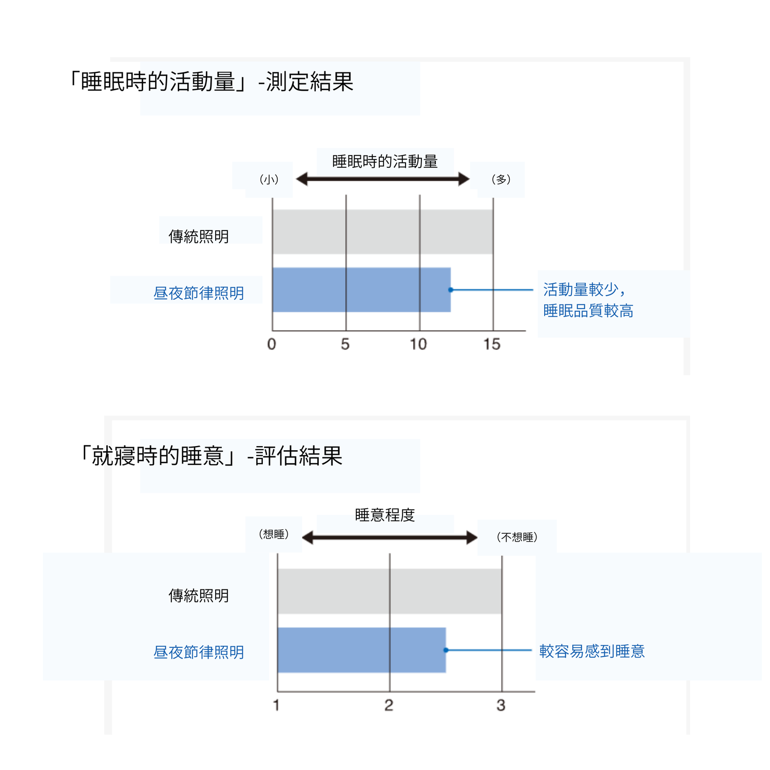 『與 2700K 照明器具相比,使用晝夜節律照明時,睡眠中的活動量較低,睡眠品質更佳。這一結果也與主觀評價相符。』