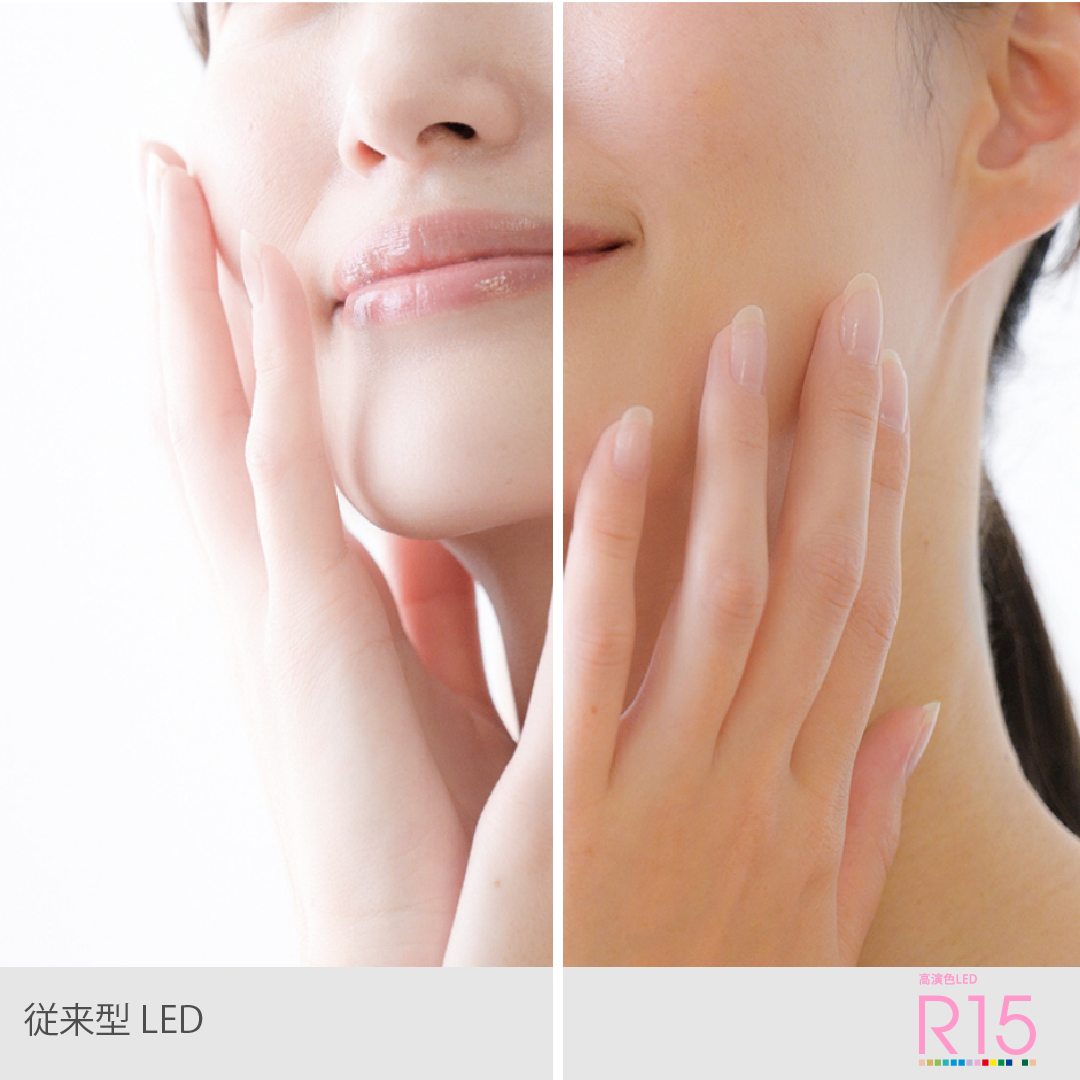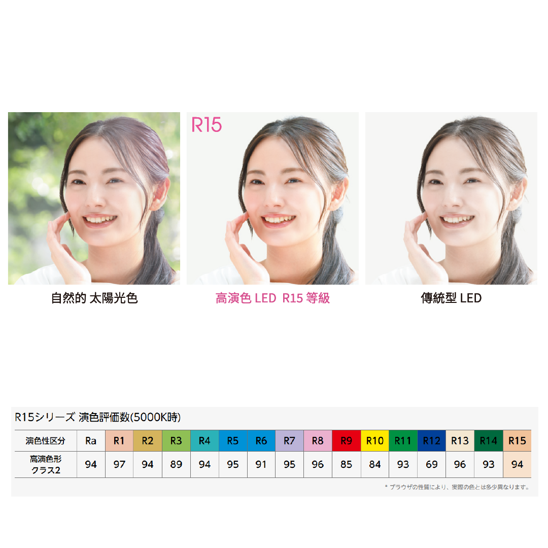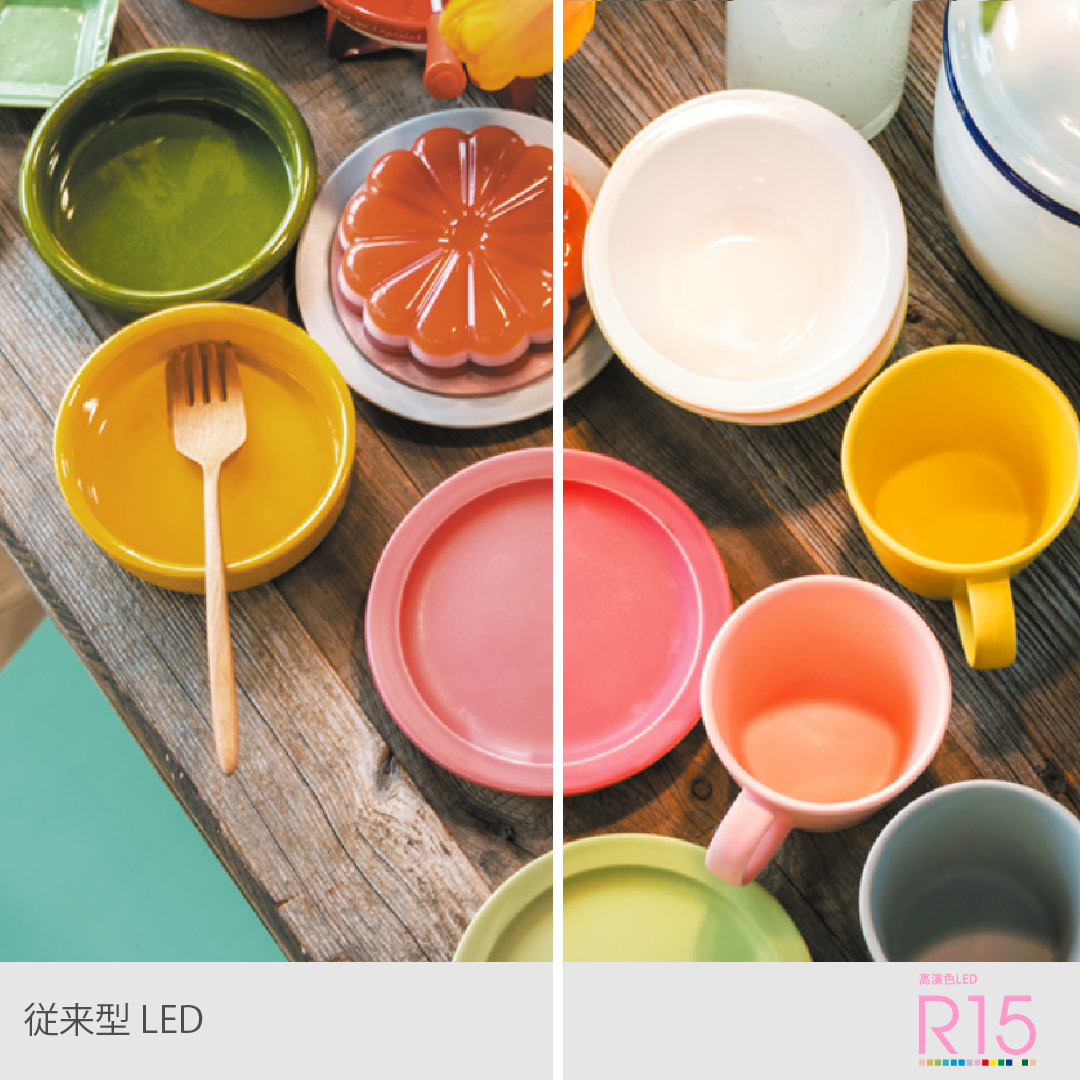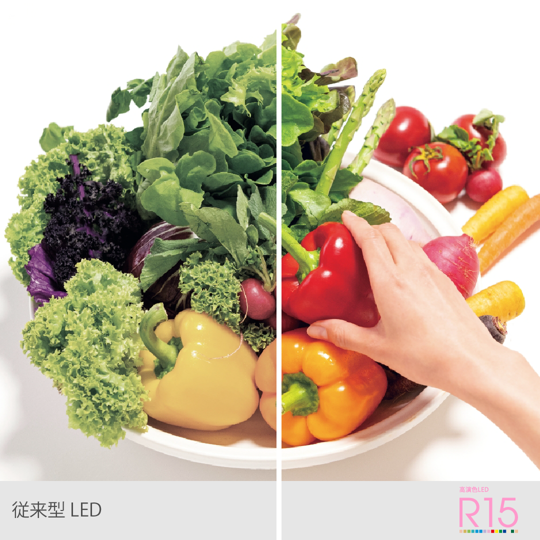 高演色的「R15」突破了過去「提升色彩還原性會大幅降低發光效率」的技術難題。在維持節能性的同時,不犧牲發光效率,優雅展現日常生活的美感。